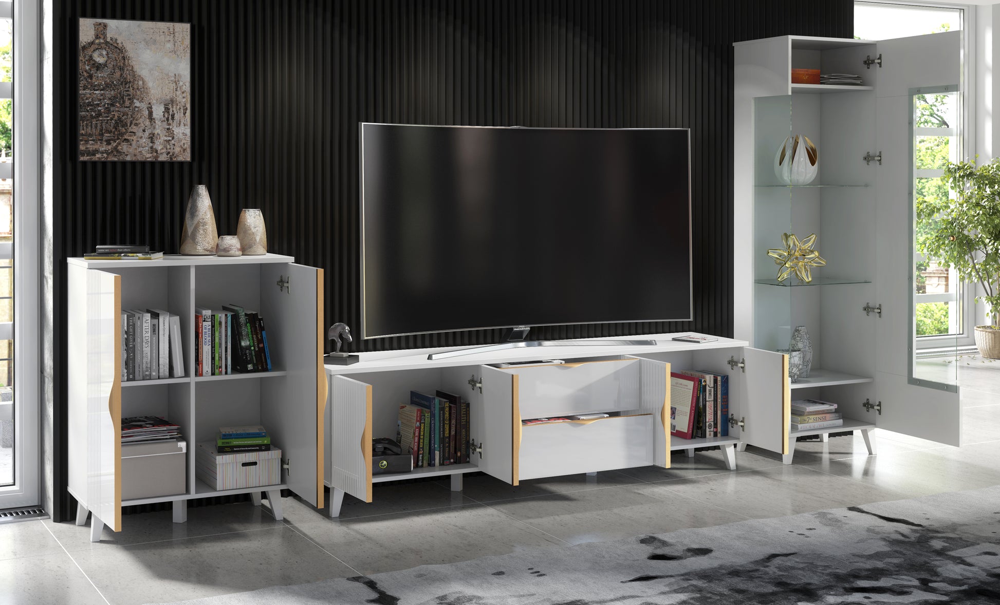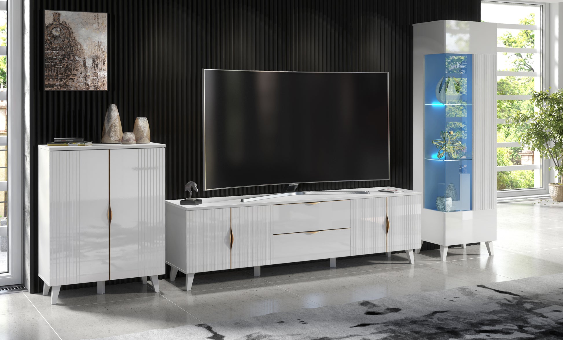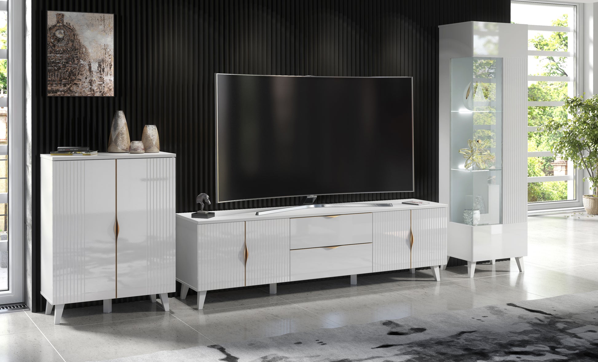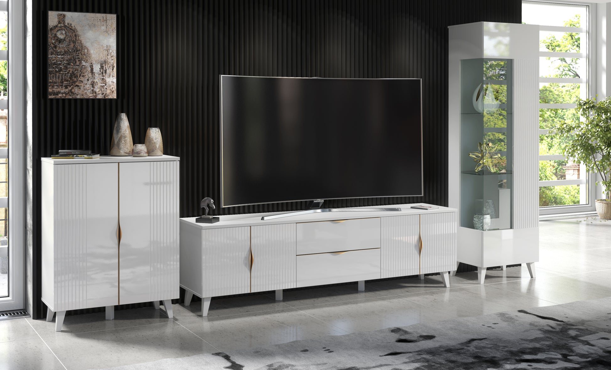 This living room set features a TV unit, display cabinet, and sideboard. These are characterised by stylish milled doors in high gloss white, body (top, sides and inside) in matt white, and brushed gold handles.