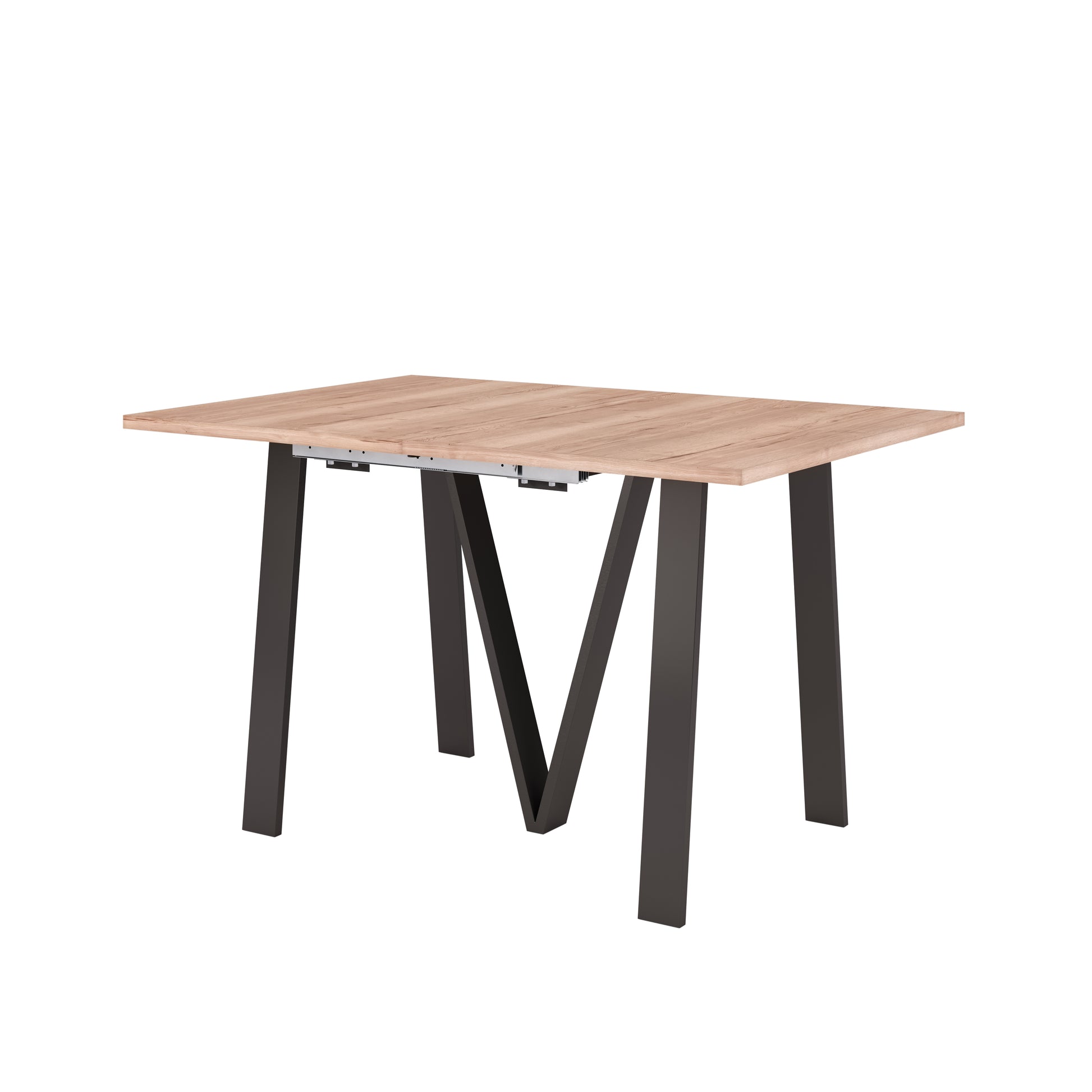 - Rectangular dining table with a modern oak-effect top and angled matte black legs