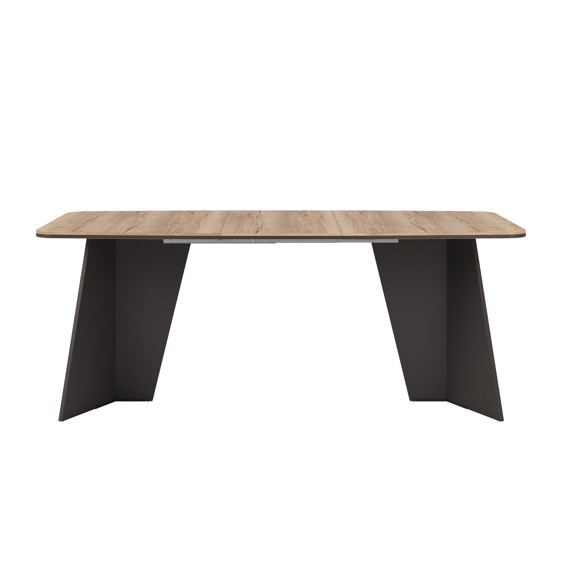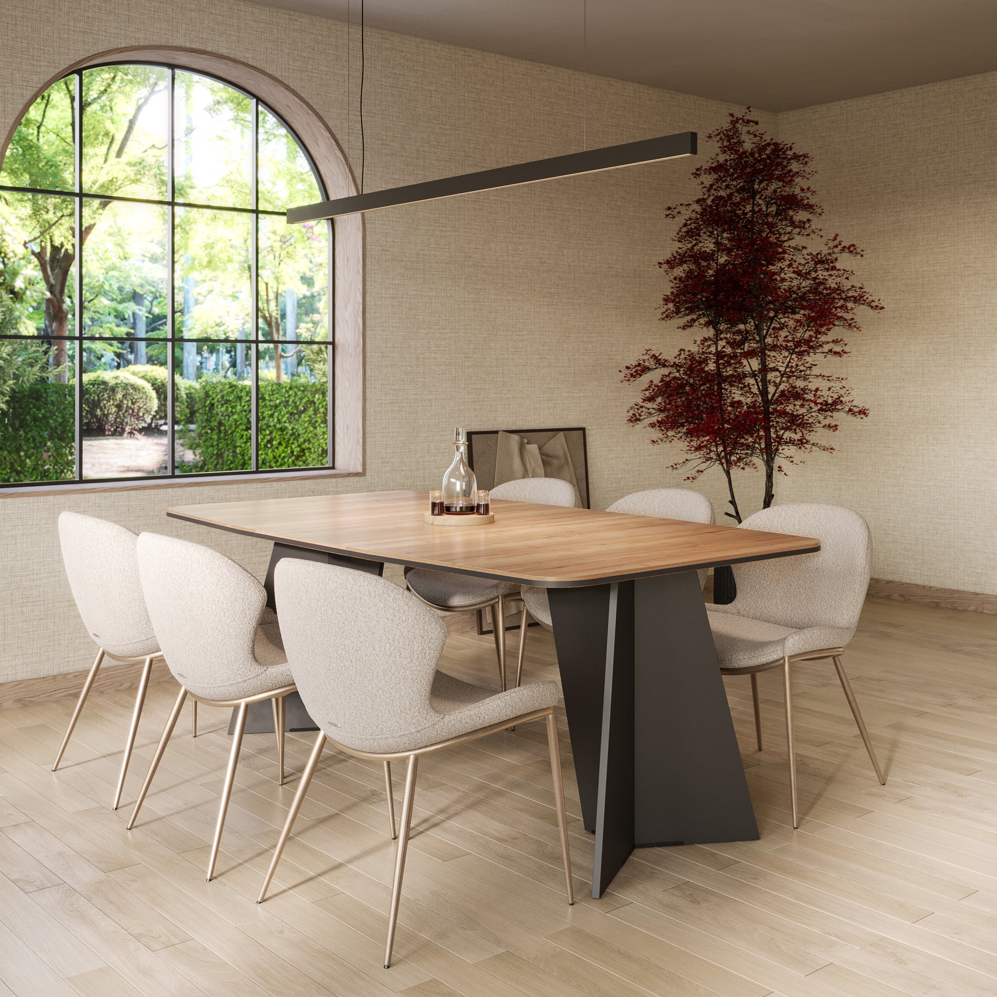 - Dining table with light oak effect top and bold matte black angular legs
