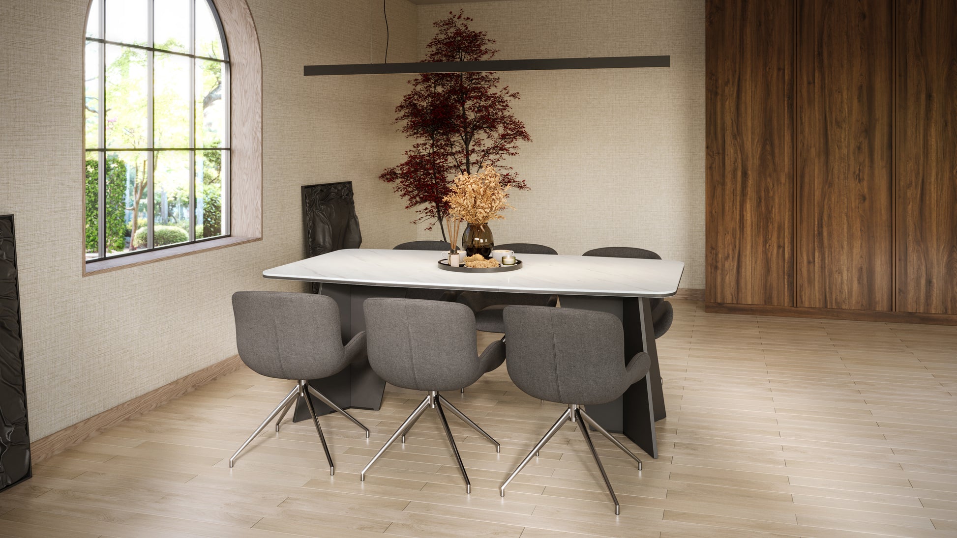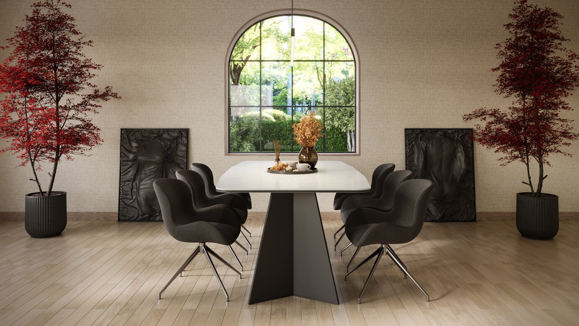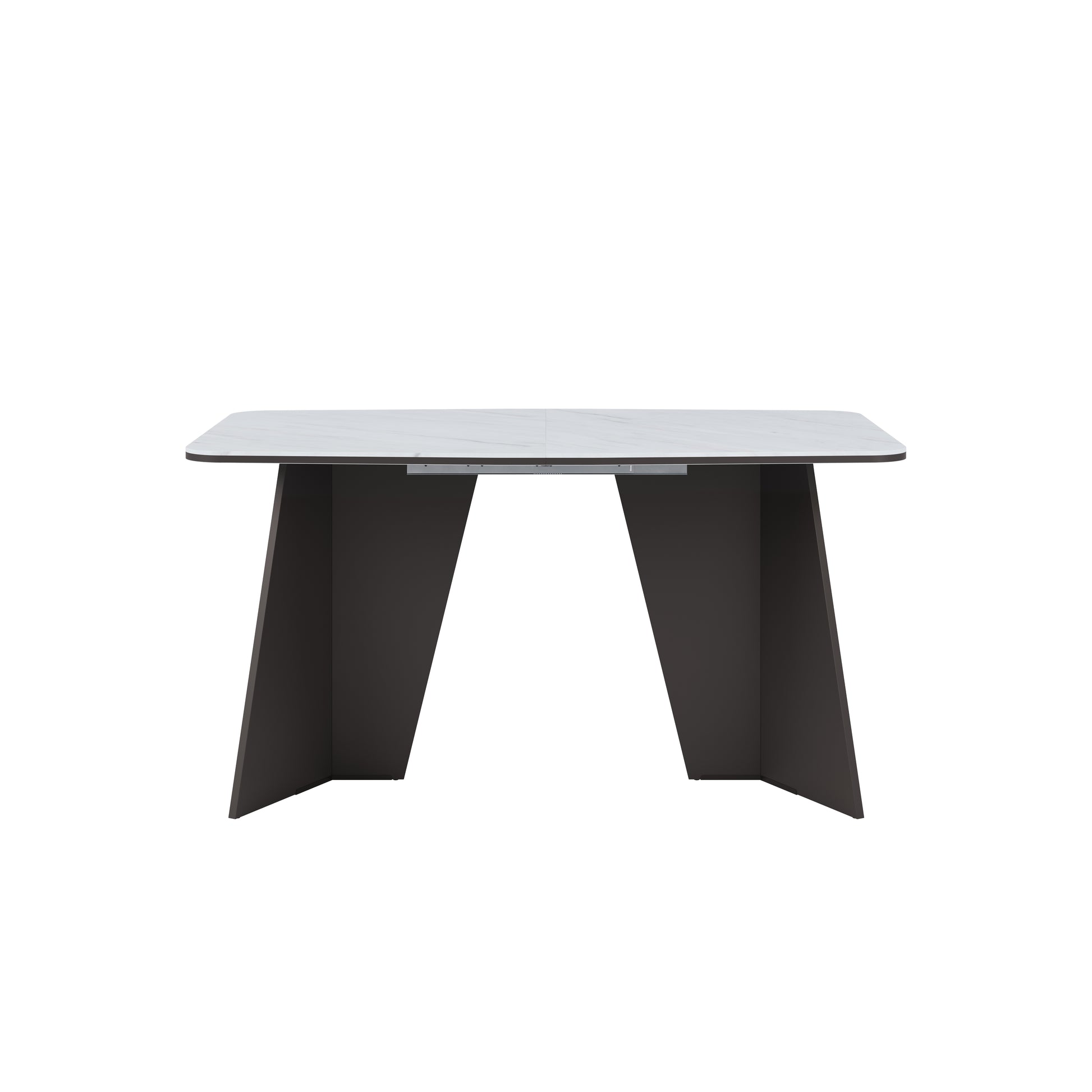 - Dining table with a white marble-effect top and bold matte black angular legs