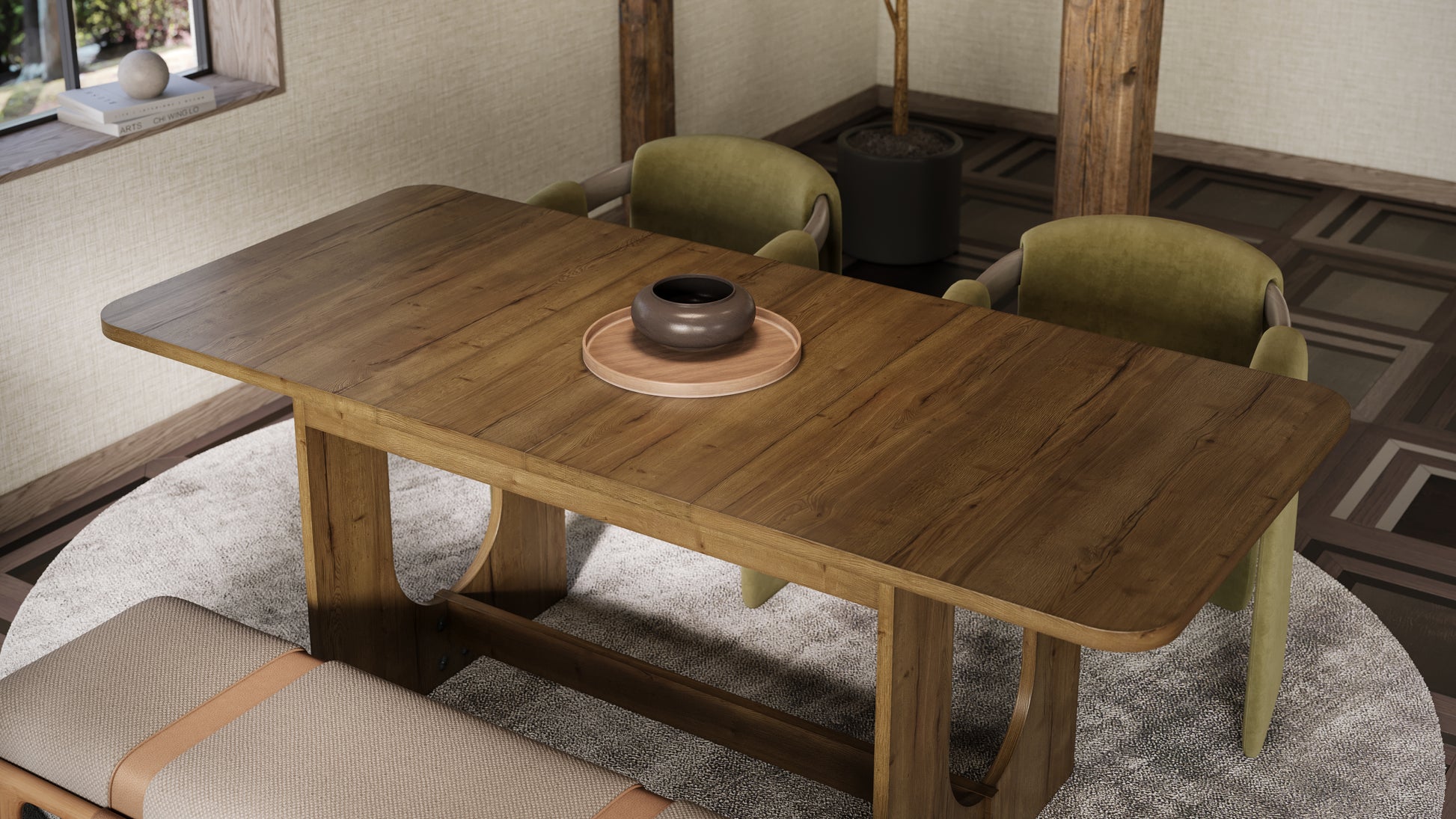 - Dining table with a dark oak-effect top and bold arched matte black legs